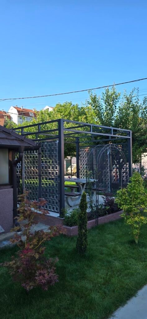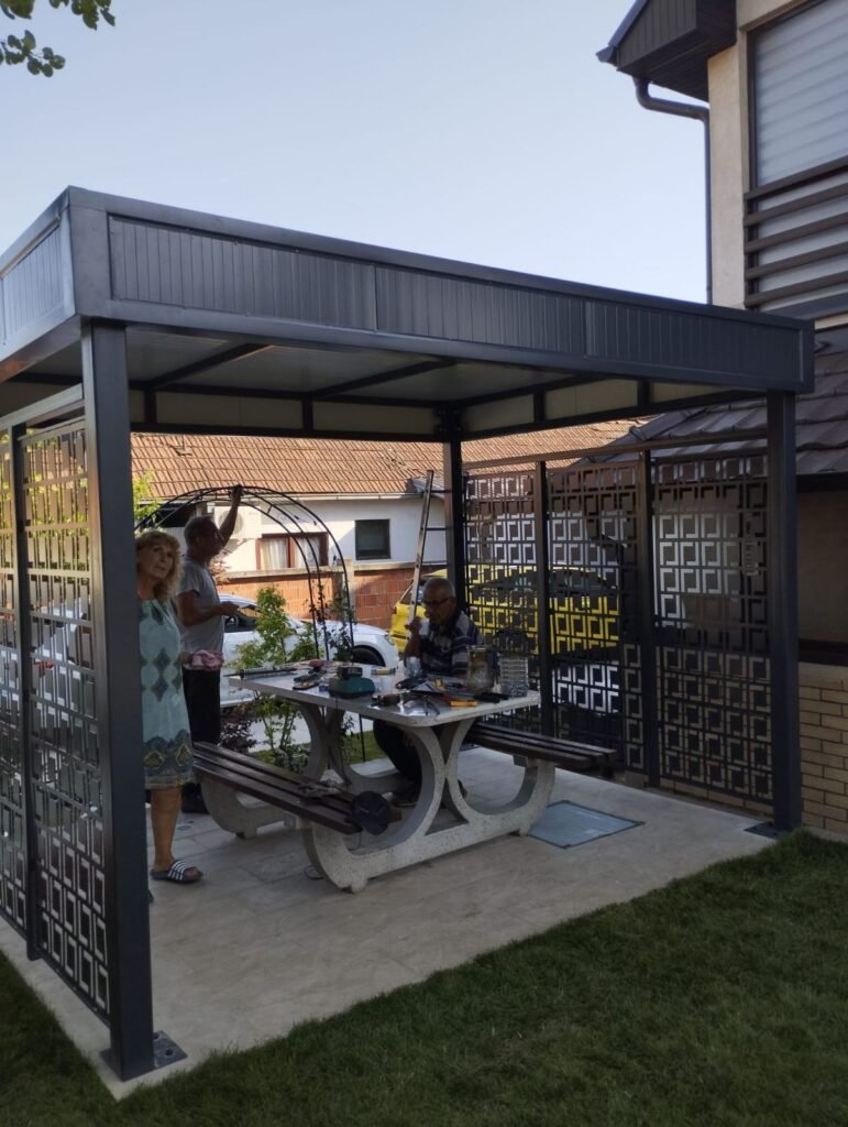 Usluga izrade nadstresnice / letnjikovca 3m x 3m sa montažom u Kragujevcu. Metalna konstrukcija obložena sa 2 strane CNC laserskim ukrasnim elementima. Pokrivena sendvič panelima i opšivena odgovarajućim opšivkama.